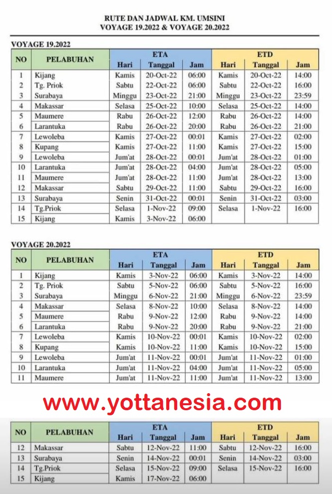 Jadwal Kapal Pelni Umsini Terbaru dengan rute Tarakan – Nunukan – Balikpapan – Parepare – Makassar – Baubau – Maumere– Larantuka– Lewoleba – kupang – Ende-Makassar – Surabaya – Jakarta – Batam – Bintan.